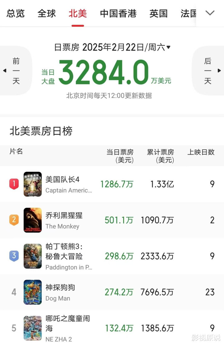 不过比较可惜的是,因为排片量很低,且《哪吒2》在登陆北美影院的同时,好莱坞的超级英雄大片《美国队长4》也有上映。所以从第二天开始,《哪吒2》的北美日票房就一直处于断崖式下滑的趋势,将近一周的时间,它的北美累计总票房都还没有达到1000万美元。